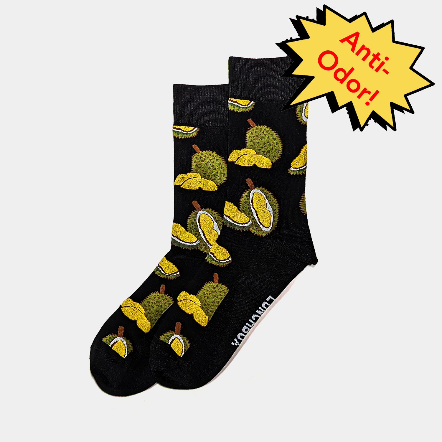 Our Durian Socks reign as king of the fruits (and feet)! Featuring unique and playful durian patterns, these cotton crew socks with anti-odor soles are a must-have for every durian enthusiast.