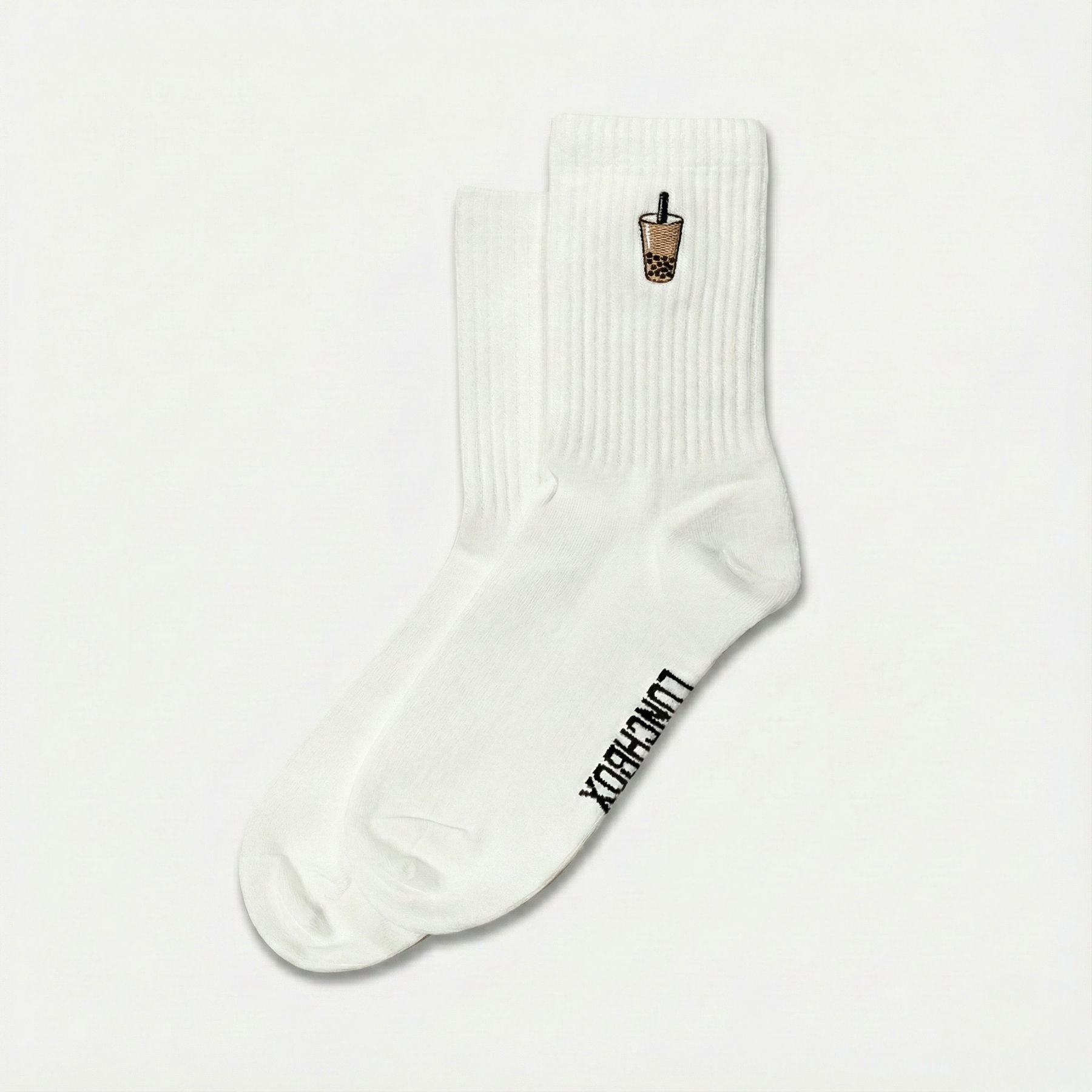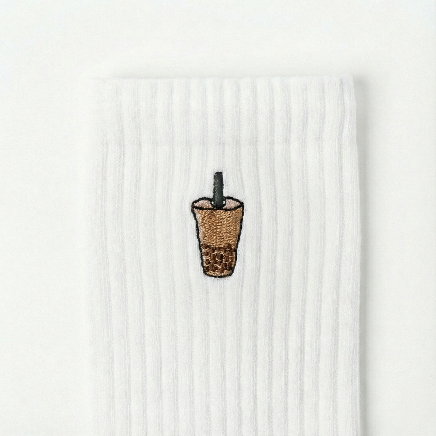Fuel your boba addiction from the feet up. These classic white crews feature a tiny, perfectly brewed bubble tea embroidery for when you need that extra sugar rush. The perfect accessory for your next 3 PM tea run.