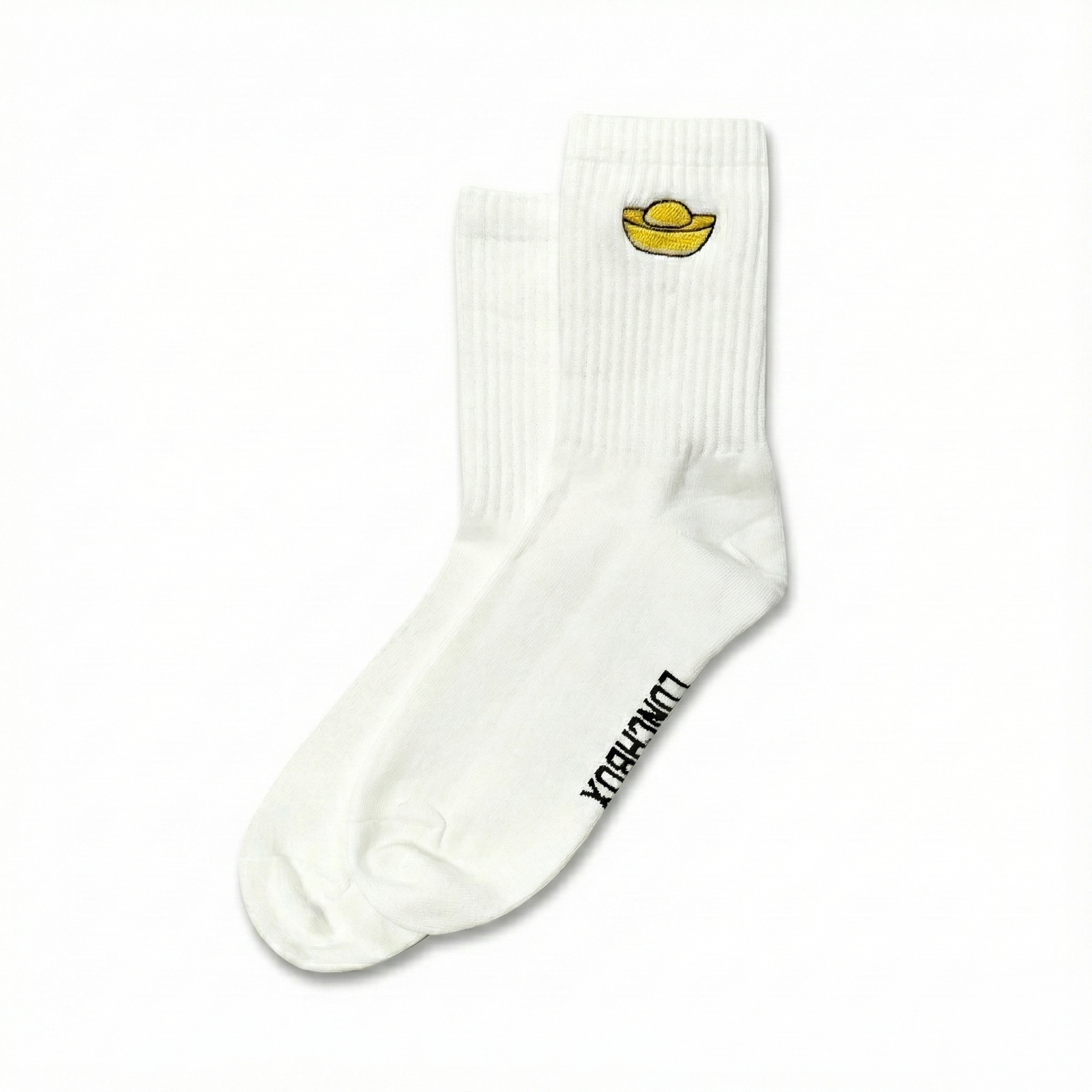 Step into prosperity and let the good fortune roll in. With a shiny gold ingot embroidered on the cuff, these socks are a subtle way to attract wealth and good vibes. Who knew securing the bag could feel this comfortable?". Socks featuring a single embroidered Ingot on plain white crew socks, perfect for any outfit.